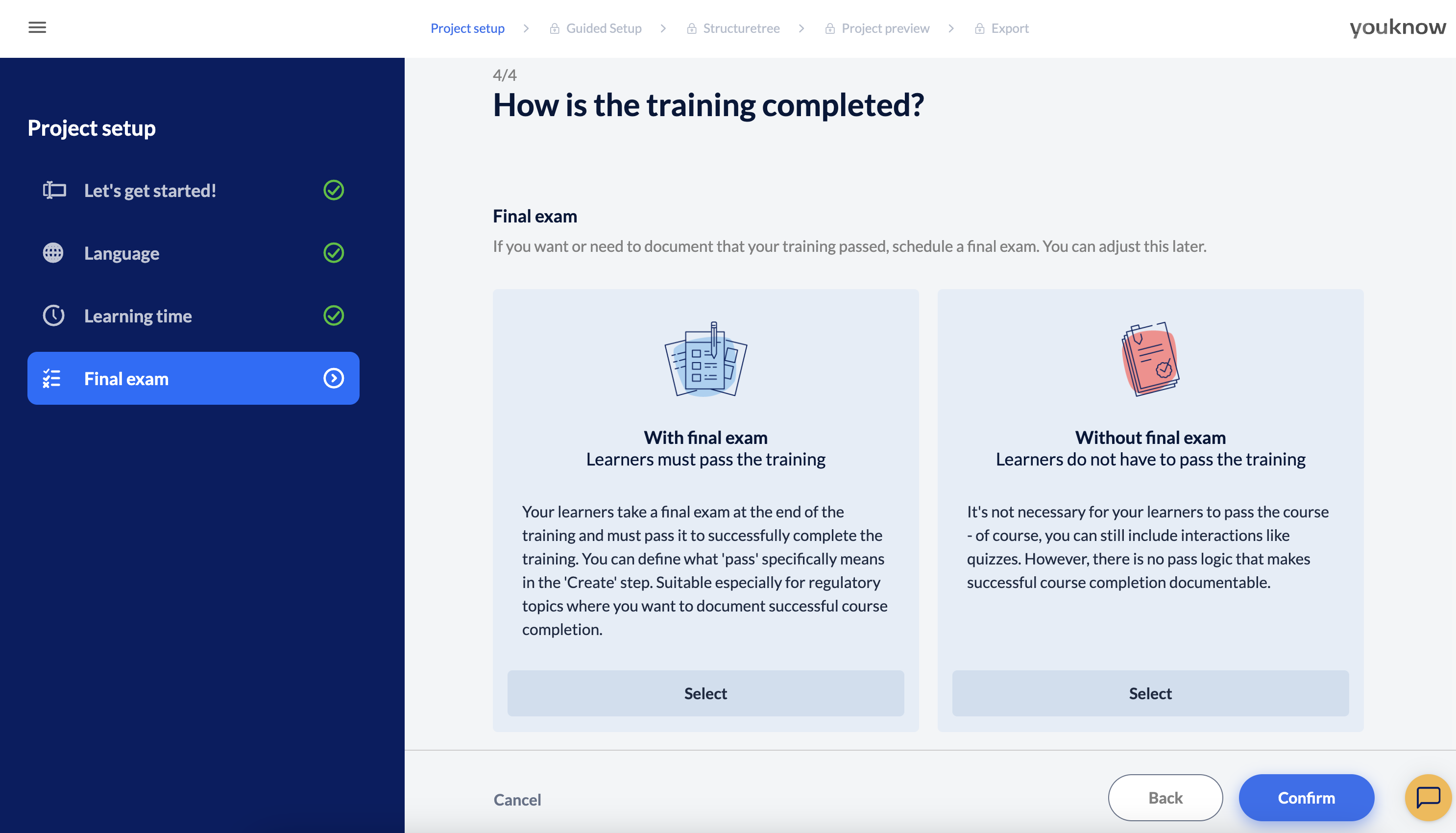 Here you define whether your project ends with a final test. The best way to make this decision is to ask yourself whether learners need to “pass” your course or whether proof of learning success is required. If you decide against a final test, you can of course still integrate interactions and quiz questions into your training. And of course, if needed, you can also add a final test later or delete it from the project if it turns out not to be necessary after all. (If no selection is made, the project will be created “With final test”.)